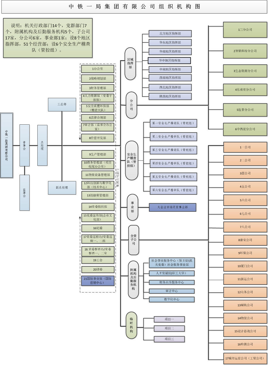 集團公司機關本部共設置21個部門,其中行政部門14個,黨群部門7個(黨委巡察辦、黨委督查辦為一套管理人員,履行相應職責)。行政部門具體為辦公室(黨委辦公室、董事會辦公室、保密委員會辦公室)、戰(zhàn)略規(guī)劃部、財務管理部、人力資源部(黨委干部部)、安全質量環(huán)保部(稽查大隊)、法律合規(guī)部、審計部(監(jiān)事會辦公室)、經(jīng)營開發(fā)部、生產(chǎn)管理部、商務管理部(項目收尾辦公室)、科技創(chuàng)新與數(shù)字化部、物資設備管理部、投融資管理部、國際事業(yè)部(國際營銷中心);黨群部門具體為黨委組織部、黨委宣傳部(企業(yè)文化部)、紀委、黨委巡察辦、黨委督查辦、工會、團委。集團公司下設8個地區(qū)指揮部,51個經(jīng)營部,負責經(jīng)營開發(fā)工作;設6個安全生產(chǎn)稽查隊(管控組)負責安全監(jiān)管工作。集團公司下設17家子公司、6家分公司、1家事業(yè)部。具體信息附圖