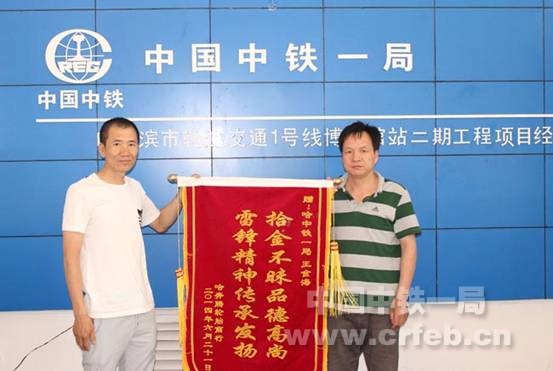 21日下午,錢包失主將一面秀著“拾金不昧品德高尚,雷鋒精神傳承發揚”的錦旗送到王金海所在項目部,以此贊揚中鐵一局員工的高尚品德。