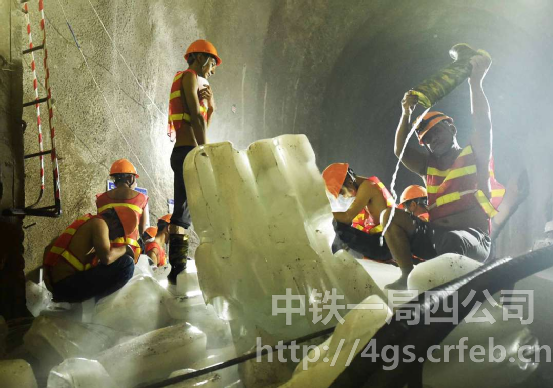 隧道的高地?zé)崾故┕きh(huán)境達(dá)到41攝氏度,工人們?cè)诒鶋K上休息,輪換作業(yè)。