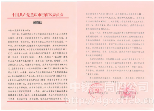 2025年,公司秉持強(qiáng)烈責(zé)任感和使命感,充分發(fā)揮專業(yè)優(yōu)勢(shì),全力推進(jìn)重黔鐵路建設(shè),在與巴南區(qū)委、區(qū)政府的協(xié)作中,雙方圍繞路地聯(lián)動(dòng)、環(huán)境整治、征拆協(xié)調(diào)等重點(diǎn)任務(wù)緊密配合,同頻共振。此次獲贈(zèng)感謝信,正是對(duì)中鐵一局擔(dān)當(dāng)作為與工作實(shí)效的充分肯定。
