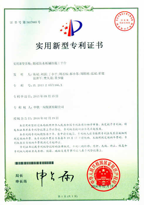 寧夏隆德訊 近日,六盤山隧道申報的《隧道防水板鋪掛施工平臺》專利在國家知識產(chǎn)權(quán)局受理后已通過審查,獲得實用新型專利證書。