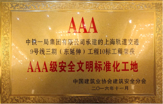 11月30日,由公司承建的上海軌道交通9號線三期(東延伸)工程10標項目喜獲中國建筑業協會建筑安全分會頒發的2016年“AAA級安全文明標準化工地”榮譽稱號。