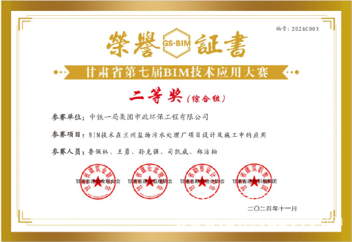 BIM技術(shù)在武威涼州城區(qū)污水處理廠工程設(shè)計及施工中的應(yīng)用成果,榮獲中國市政工程協(xié)會舉辦的2024年第六屆“市政杯”BIM應(yīng)用技能大賽二類成果及2024年甘肅省第七屆BIM技術(shù)應(yīng)用大賽一等獎。BIM技術(shù)在蕭山錢江超大型地埋式污水處理廠設(shè)計及施工中的應(yīng)用成果,榮獲第五屆工程建設(shè)行業(yè)BIM大賽三等成果。BIM技術(shù)在蘭州鹽場污水處理廠項(xiàng)目設(shè)計及施工中的應(yīng)用成果,榮獲2024年甘肅省第七屆BIM技術(shù)應(yīng)用大賽二等獎。