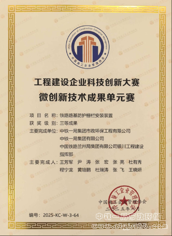 近日,從中國施工企業管理協會傳來喜訊,市政環保公司銀巴鐵路項目申報的《鐵路路基防護柵欄安裝裝置》成果,榮獲工程建設企業科技創新大賽微創新技術成果單元賽“三等成果”。該成果曾獲批國家知識產權局頒發的國家實用新型專利。