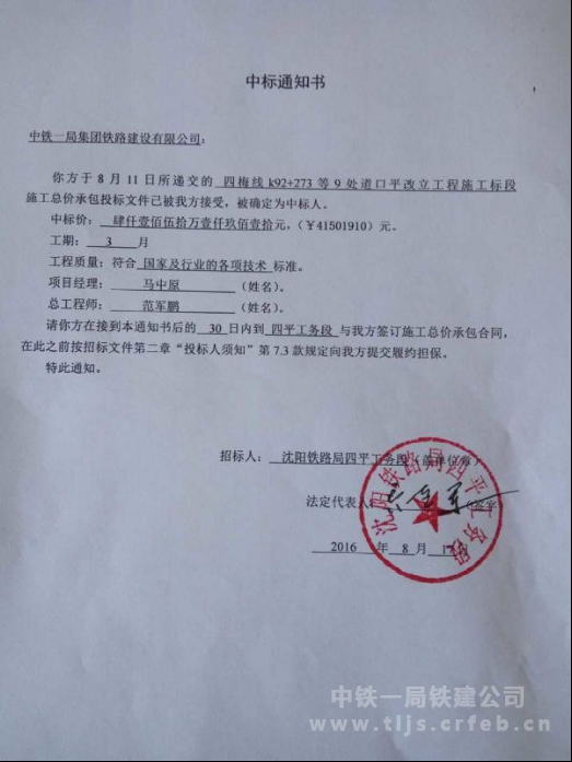 在公司領導的高度重視,平齊項目部和公司經營開發部的不懈努力下,8月17日,首次使用公司鐵路工程施工總承包一級資質中標沈陽鐵路局四梅線K92+273、K93+700等9處平改立工程項目,中標金額4150.19萬元,工期3個月。