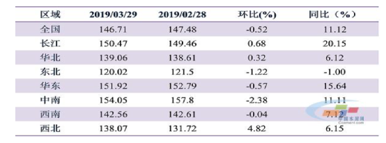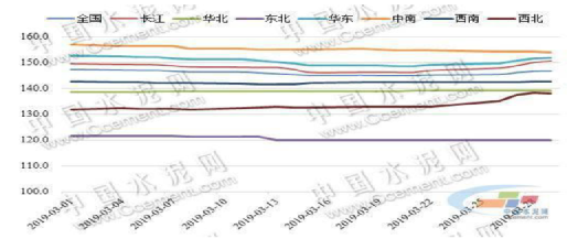 2019 年3月,全國六大區域水泥行情分化,漲跌互現。西北和華北地區價格上漲,西北領漲,由于冬儲優惠的結束,水泥價格回漲,3 月環比大漲4.82%;華北行情基本保持穩定,其他四大區域價格環比下滑。東北、中南地區月內持續下滑,當月分別環比下滑1.22%和2.38%,東北地區停窯結束,需求恢復緩慢,遼寧價格有所下滑;中南地區受陰雨天氣、部分地區需求下滑等影響,多數地區價格均在下滑。華東和西南月初下滑,下旬見底后已回漲,當月環比小幅下滑0.57%和0.04%,華東地區已止跌回漲,長三角即將開啟第一輪普漲;西南方面,隨著天氣的好轉需求環比回升,月底四川已開始推漲,預計下月華東和西南將會呈現漲勢。