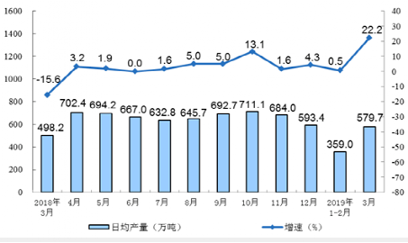 據國家統計局數據,2019年3月份,全國規模以上工業企業生產水泥17971萬噸,同比大增22.2%。1-3月累計,生產水泥39160萬噸,同比增長9.4%。3月份,全國水泥日均產量579.7萬噸,同比減少81.5萬噸,降幅16.4%;環比增長220.7萬噸,增幅61.5%。