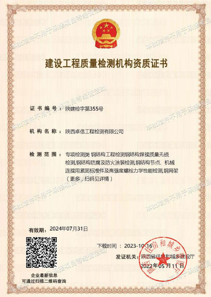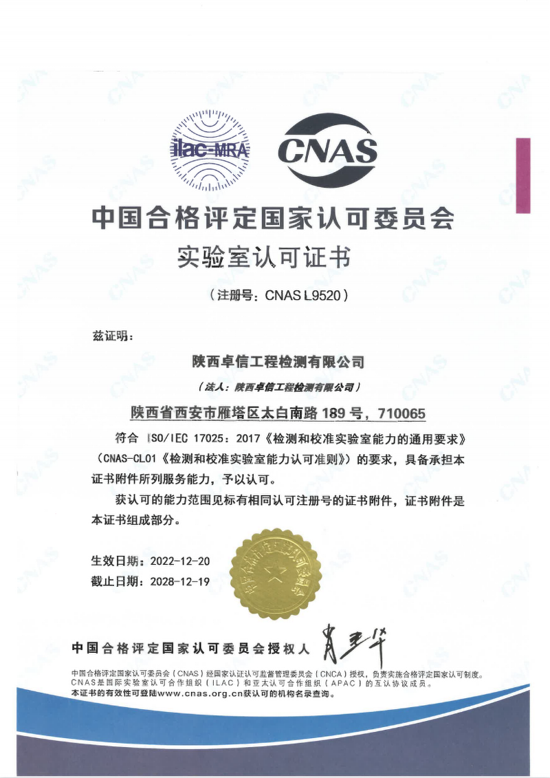 可承擔膠凝材料、骨料及集料、外加劑、金屬材料、墻體材料、瀝青及混合料、防水材料、管材及透水材料、土工合成材料、纖維、錨固材料、注漿材料、水、填料及道砟、混凝土及砂漿、巖土、工程結構、環境檢測、軌道交通、橋梁工程等工程質量檢測業務